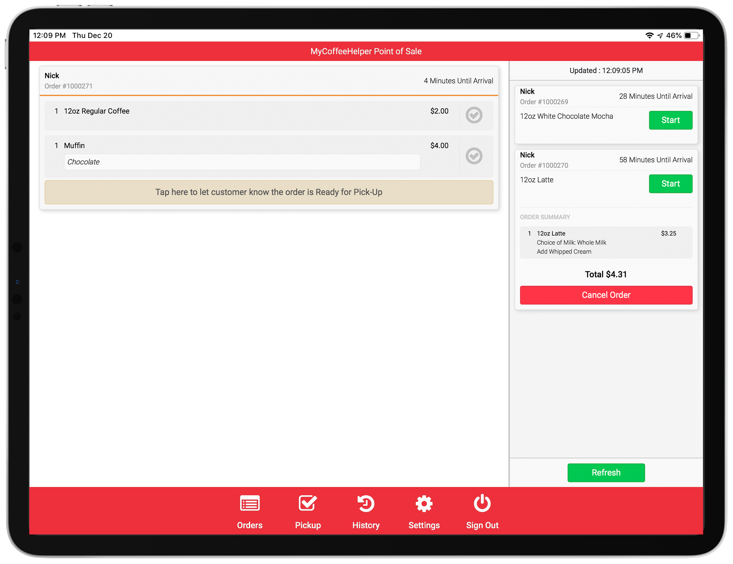 The MyMenuHelper Point of Sale App is an intuitive and easy to use app that allows you to quickly review, process and manage customer orders for your coffee and tea business!